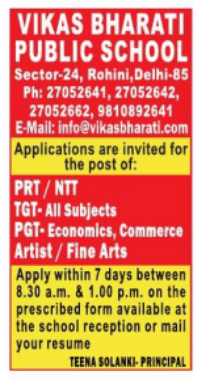 Vikas Bharati Public School Rohini invites applications for PRT, NTT, TGT, PGT Economics & Commerce, and Fine Arts teacher posts. Apply within 7 days via walk-in or email. Teaching jobs in Delhi.