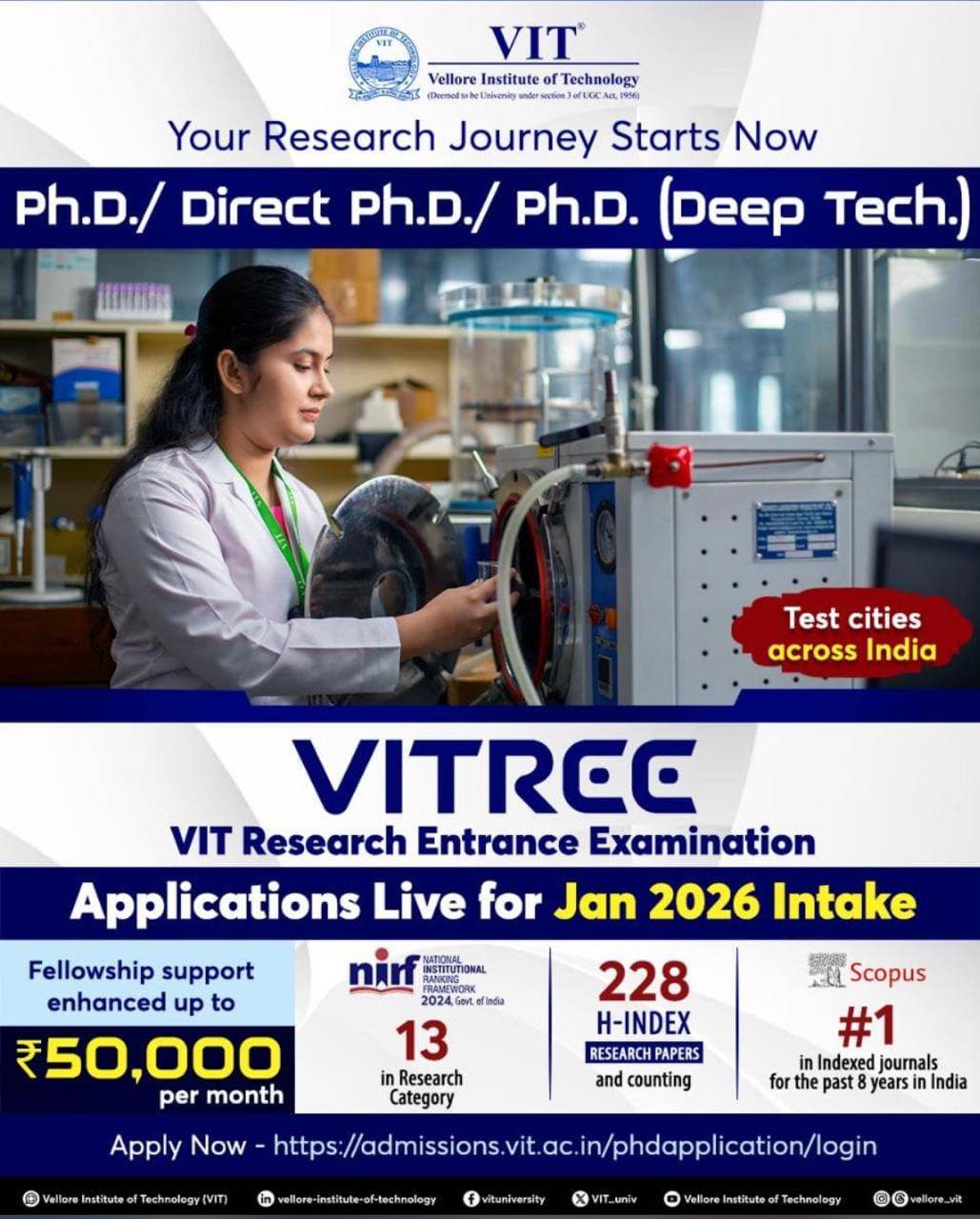 Vellore Institute of Technology (VIT), one of India’s leading institutions of higher learning, invites applications for admission to its Ph.D., Direct Ph.D., and Ph.D. (Deep Tech) programs through the VIT Research Entrance Examination (VITREE) for the January 2026 intake. Recognized globally for research excellence, innovation, and industry collaborations, VIT offers a stimulating environment for aspiring scholars to pursue cutting-edge research across diverse disciplines.