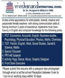 Vivekanand International School, Patparganj, Delhi invites applications for PGT, TGT, PRT, Special Educator, Activity Teachers, and Front Desk Executive posts. Apply within 10 days.